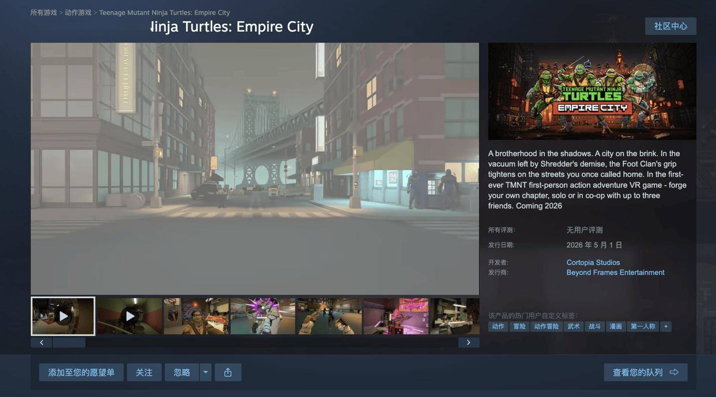 目前,本作已在 Steam 平台开启试玩,IT之家附 Steam 页面(https://store.steampowered.com/app/3713650/Teenage_Mutant_Ninja_Turtles_Empire_City/)。
