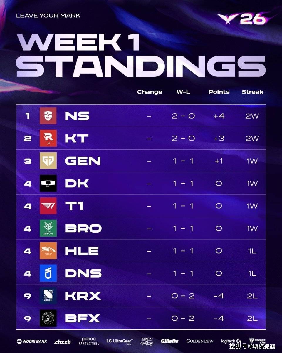 LCK联赛的第1-2轮常规赛是从4月1号就开始的,一周比赛结束后,整个积分榜的形势与此前联赛开局大为不同,首先GEN和T1在本周都有一场翻车,且皆败在了KT手里,他们先是2-0横扫了T1,然后又打满三局的情况下击败GEN,目前位列联赛第二,而联赛第一居然是NS,NS这个队伍在本周的对手都是联赛中游的队伍,先是2-0横扫DK,然后又虐了DNS。
