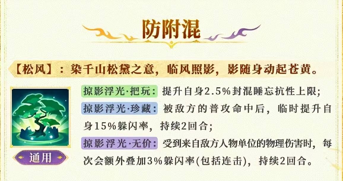 松风套装主要是增加躲闪率的,因此才会有玩家第一反应就说,适合雅声闪躲鬼使用。珍藏效果是被普攻击中后,临时提升自身15%躲闪率,持续2回合;