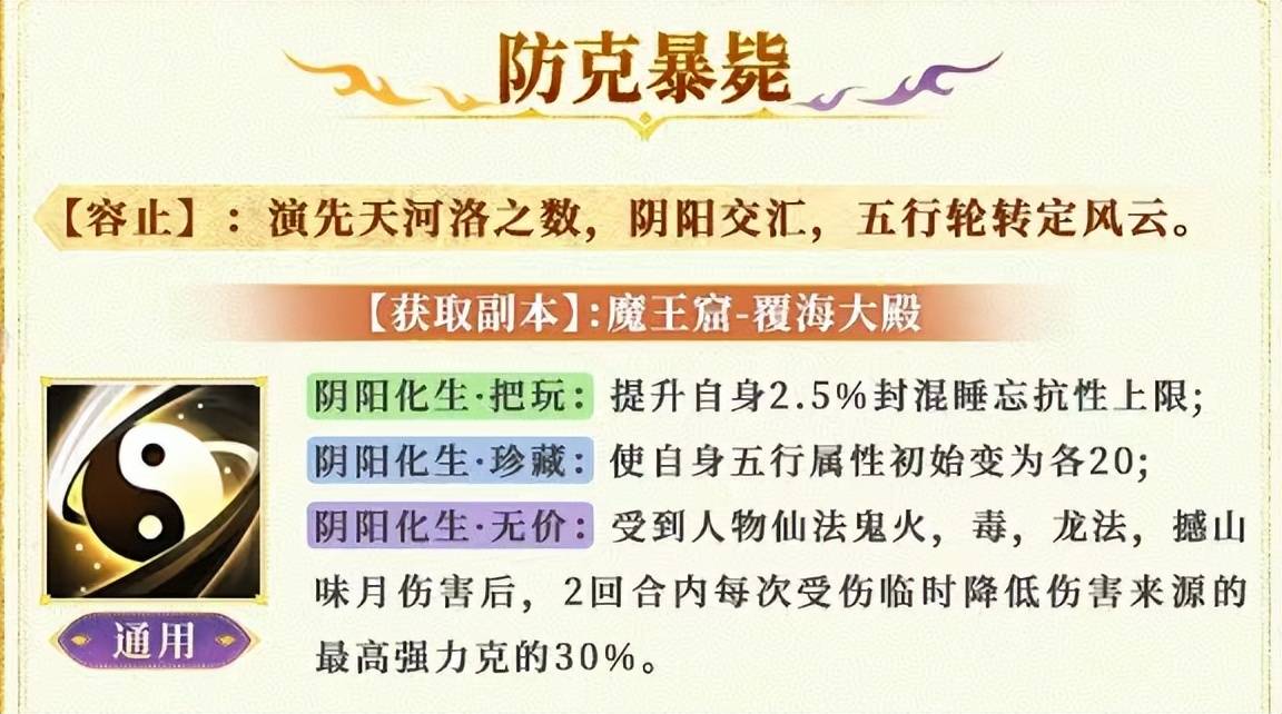 容止获取难度较低,通过魔王窟-覆海大殿就可以获得,珍藏效果就可以使自身五行属性初始变为各20,彻底避免了被针对秒杀,绝对是仙族“克火炮”首选,也适用于男鬼/女鬼打造铁鬼。