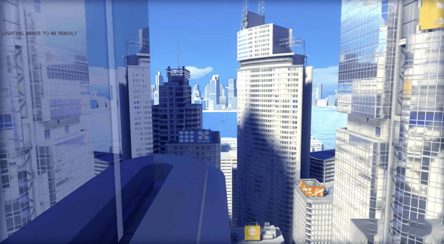 同时,游戏开场阶段包含一段未在正式版中出现的独白。主角 Faith Connors 在开场直接向玩家介绍世界观,但台词和表现效果颇为生硬,与正式版采用的无声开场设计形成了鲜明对比。
