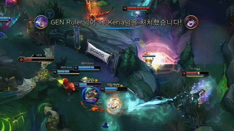 开局阶段Faker对线出事,被Chovy爆压残血回家,双方第一波野区碰撞Faker残血进场后阵亡,Duro辅助妮蔲拿下三杀,Peyz则拿下双杀,双方都能接受,但随后的河道团战GEN打野先手进场虽然阵亡,但后续作战中GEN击杀T1中野,占据场面优势并且控掉了两条小龙。