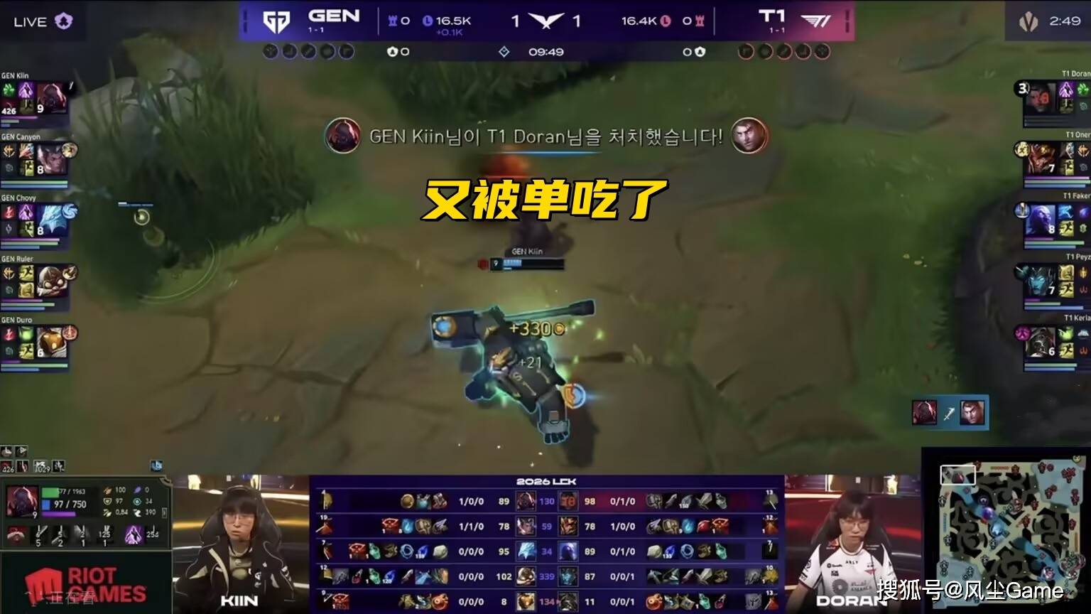 打到中期,GEN小领先1千来块,但龙塔资源,GEN拿得太多了,决胜团GEN也打得更好,同时收到大龙和龙魂,T1到24分钟就玩不了了,后面都是垃圾时间,第二把老李掏出招牌加里奥,对线大超的安妮,前期为了争和河蟹,两边爆发团战,GEN打出三换二,但人头全被辅助给K了。