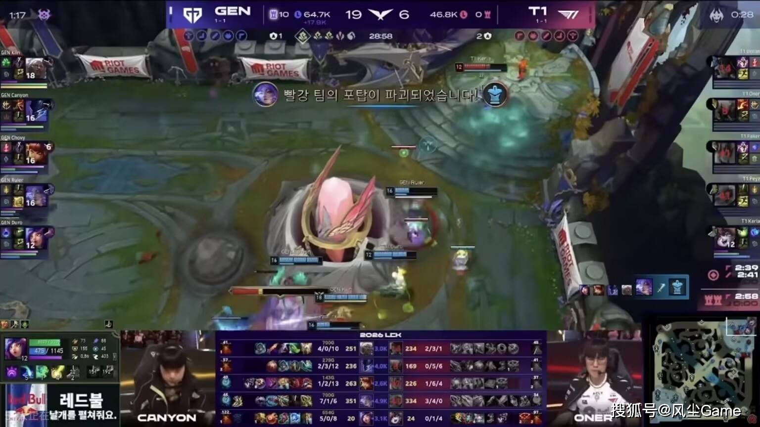 Peyz虽然阵亡,但拿了两个头,这把的希望,可以说都在他身上,但吃了头的Peyz,对线依旧被压制,中下路都没线权,打野一条龙都控不到,才18分钟GEN小龙就停牌了,被迫接团的T1,不仅没抢到龙,还被打出一波2换4,这波之后T1就没得玩了,GEN拿到龙魂滚起雪球,直接结束。