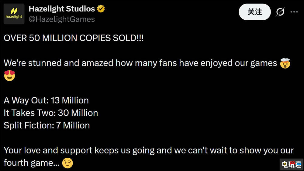 Hazelight Studios官方在其社交账号上发布了这一喜讯。官方称《逃出生天》、《双人成行》与《双影奇境》三部作品的累计销量已经突破5000万份,其中作为工作室首款游戏的《逃出生天》8年时间卖出了1300万份,工作室真正里程碑的《双人成行》5年就卖出了3000万份,而最新作《双影奇境》也在1年的时间里卖出了700万份。官方表示,玩家的喜爱与支持是他们不断前进的动力。