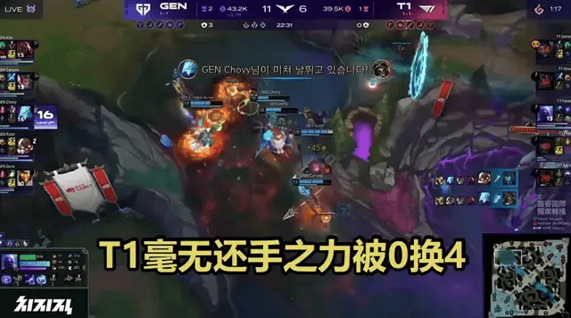 先说说第一局,T1全线哑火,上路Doran杰斯被Kiin塞恩单杀,中路Faker瑞兹被Chovy冰鸟死死锁住,打野Oner皇子全场梦游。GEN稳扎稳打,龙坑团战连续两波1换4直接带走比赛。第一局就已经够惨了,没想到第二局更离谱。