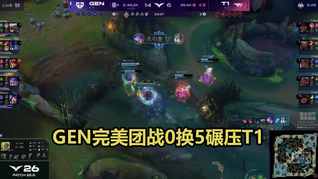23分钟龙魂团,Faker加里奥闪现W开团失败,GEN梦魇关灯配合狼母进场收割,Peyz再次阵亡,T1被团灭。GEN拿下龙魂加大龙,经济优势拉到无法逆转。最终Faker加里奥战绩定格在1-6,被网友调侃“研发i6成功”。GEN轻松推平高地,两局比赛T1全程被碾压,毫无还手之力。