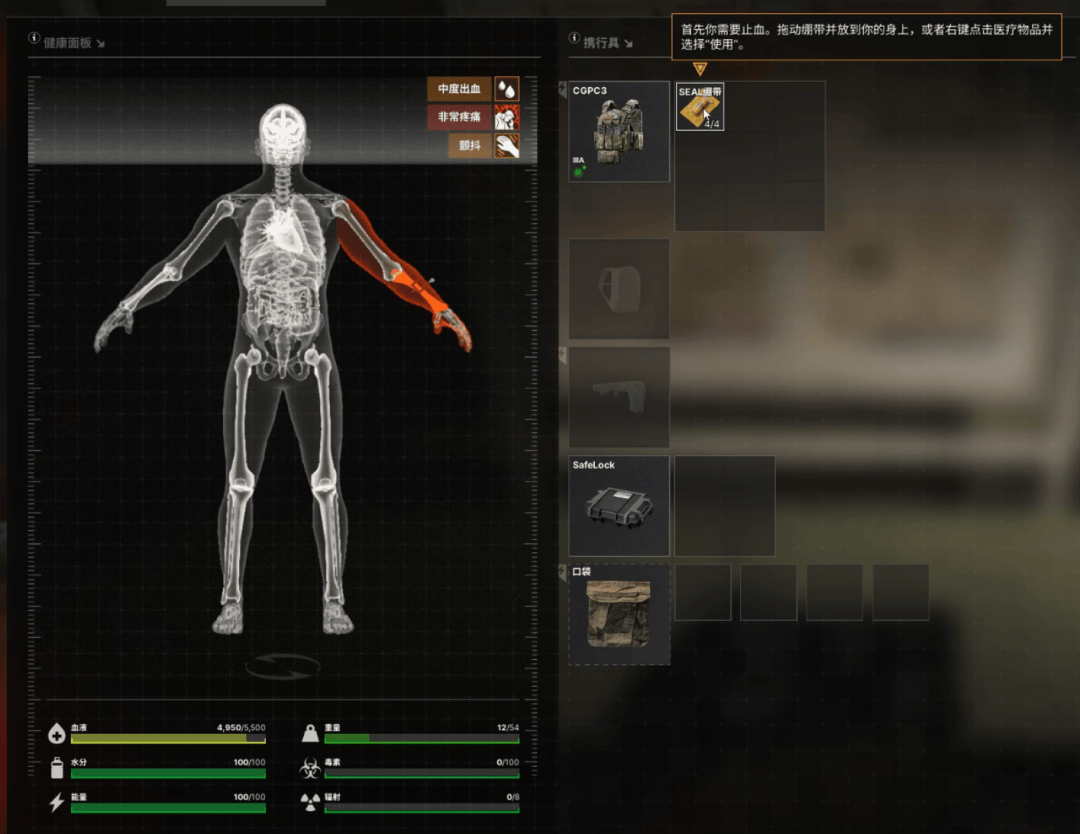 灰区没有部位生命值的设计,取而代之的是全身的“血液条”,上限5500ml,略高于现实中正常体型成年男性的总血液量——考虑到玩家雇佣兵个个健壮如牛,倒也合理。在游戏中,子弹命中角色可能造成失血,不及时处理就会导致角色晕头转向、视线模糊。失血超过一半,也会造成昏迷。