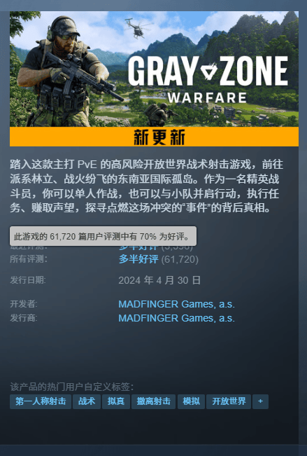 作为一款将“战术”“拟真”“撤离射击”写在标签里的游戏,玩家们都习惯把《灰区战争》跟那位“搜打撤严父”——《逃离塔科夫》去横向对比。一比吓一跳,《逃离塔科夫》还在“褒贬不一”,而《灰区战争》(以下简称“灰区”)口碑已经回升至“多半好评”了。