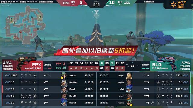 第八回合,BerLIN在C大拿下三杀终于帮助FPX拿下第一分。第九回合,FPX再追一分BLG叫出暂停。第十回合,双方在A点里的一波大混战最后由FPX拿下胜利。