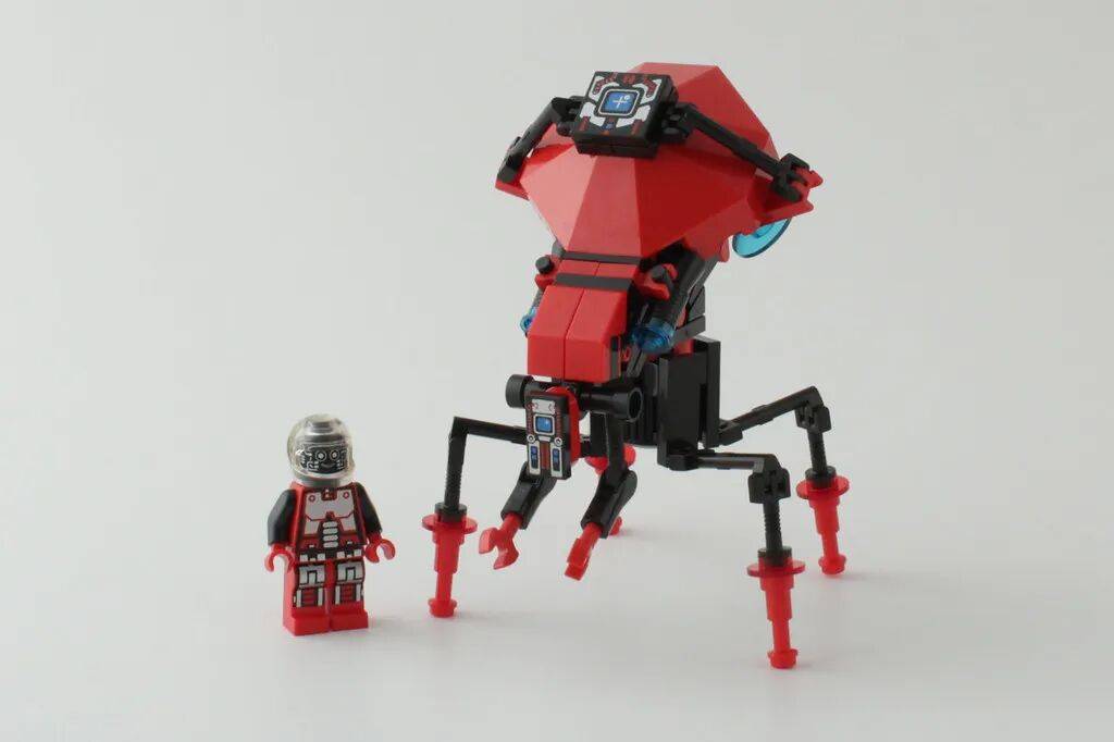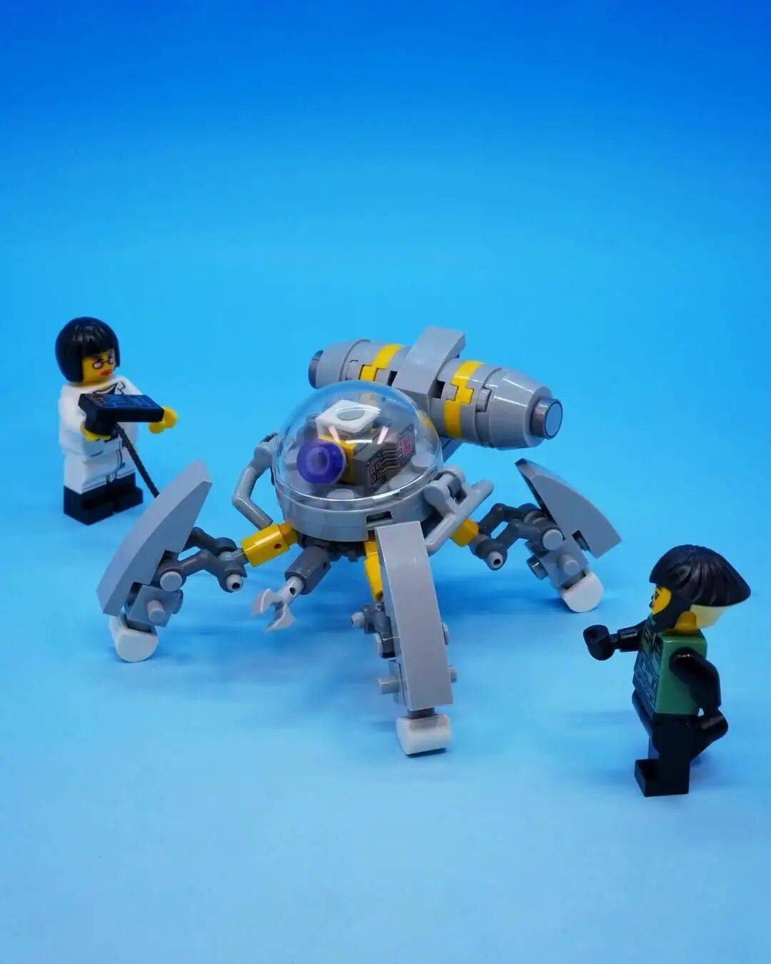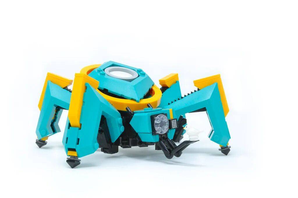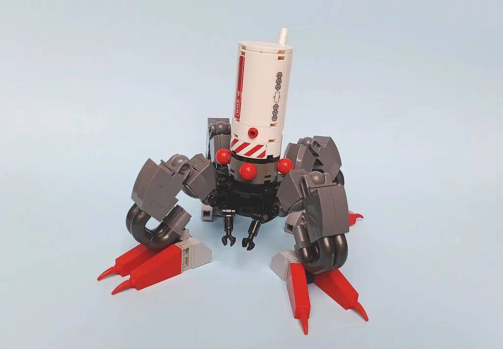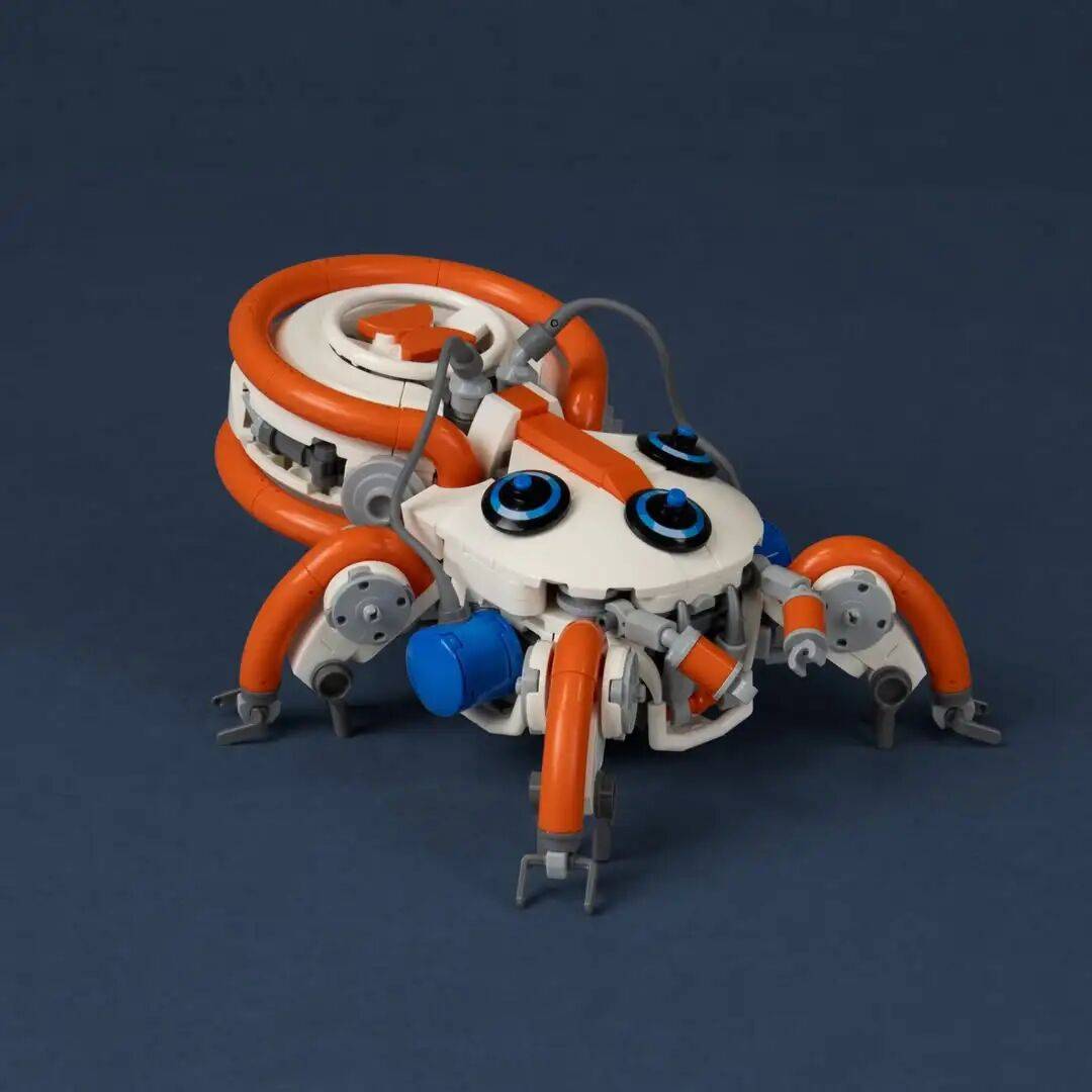 乐高设计师 Theo Bonner 也参与了,他的作品巧妙使用橙色弯管件和多种曲面零件,三个眼睛的设计更强化了蜘蛛般的视觉效果。
