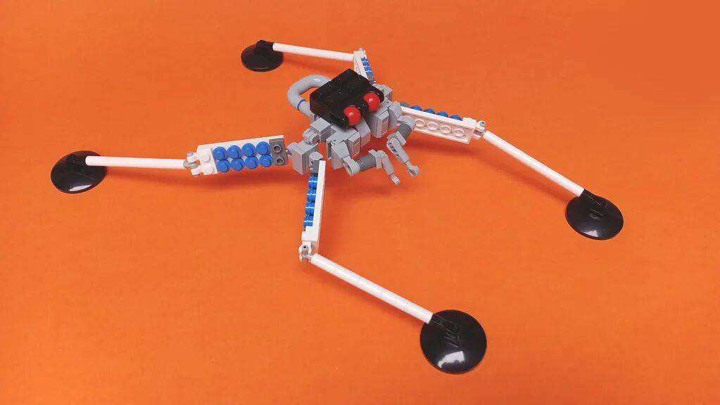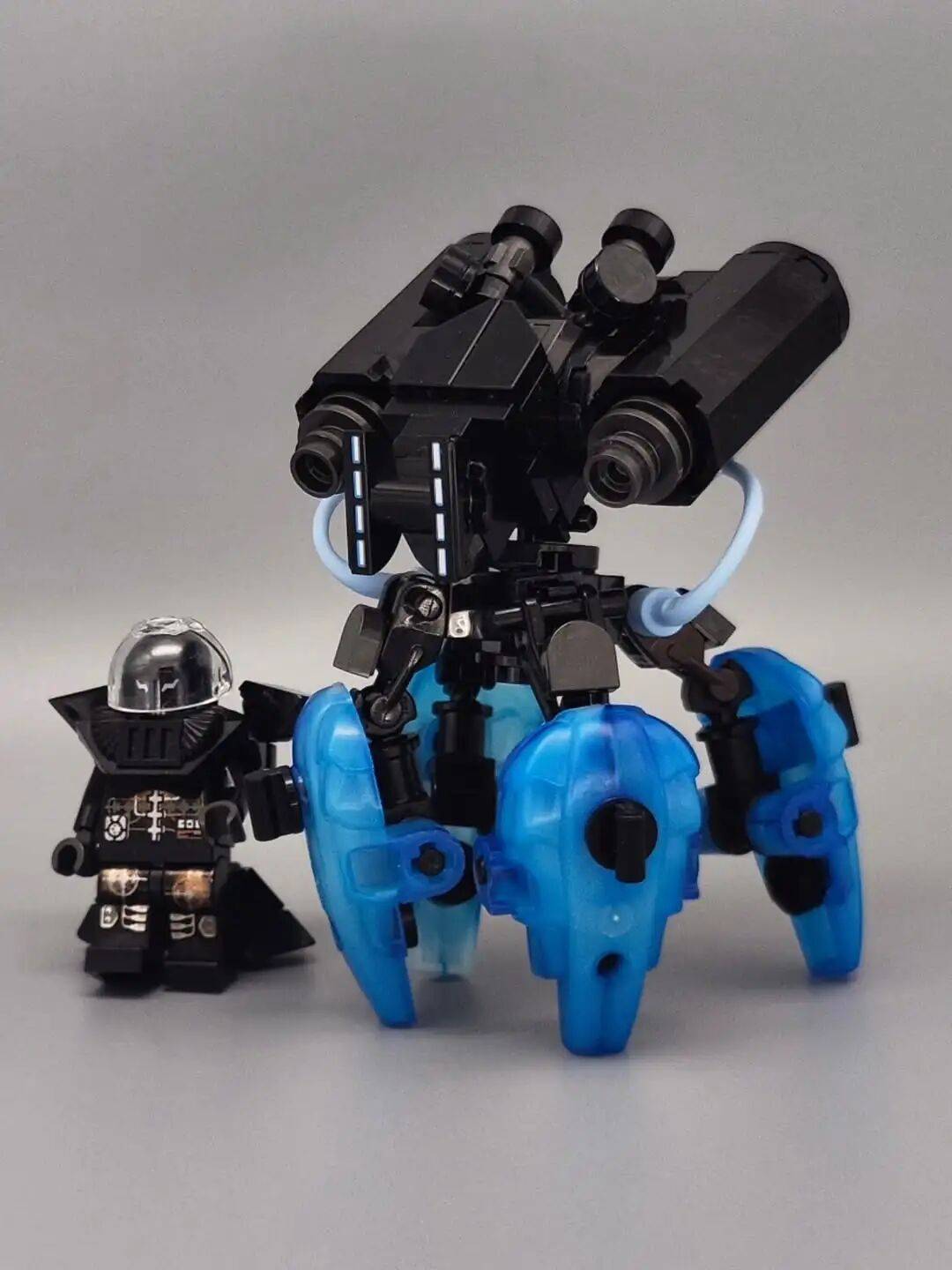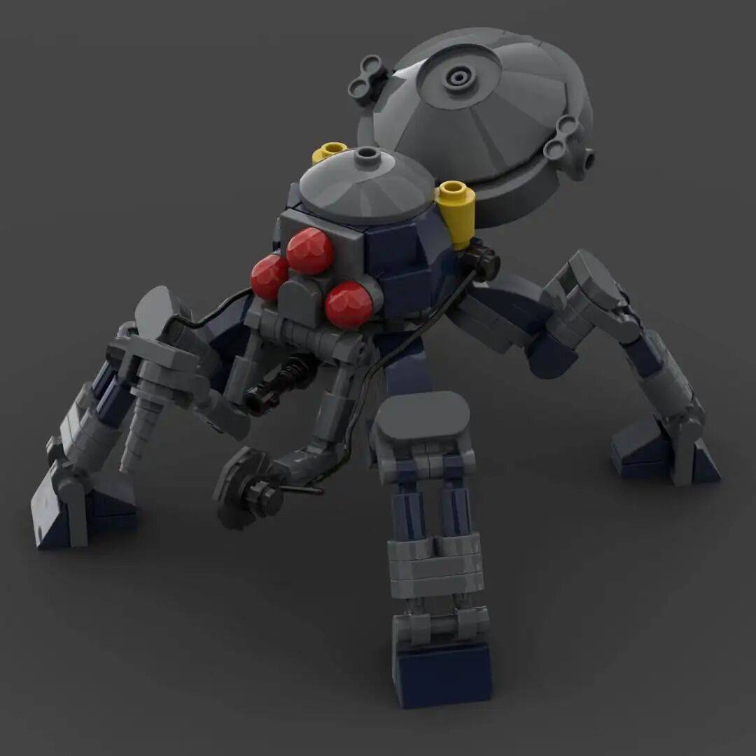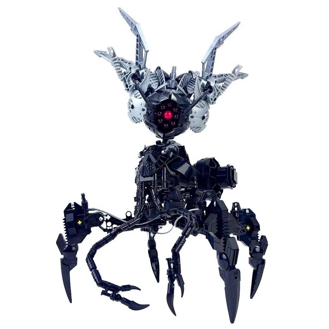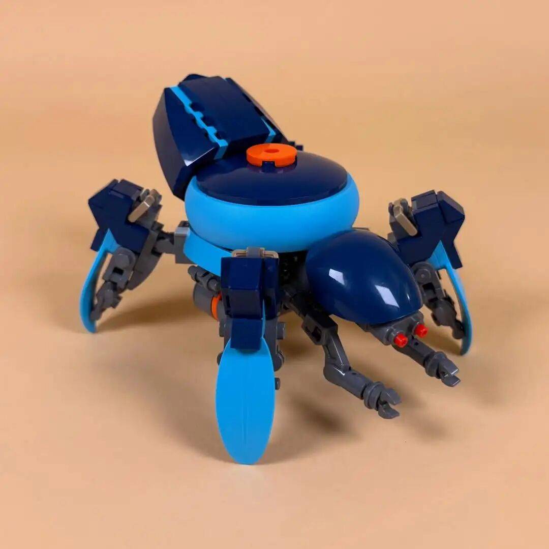乐高设计师 Theo Bonner 也参与了,他的作品巧妙使用橙色弯管件和多种曲面零件,三个眼睛的设计更强化了蜘蛛般的视觉效果。