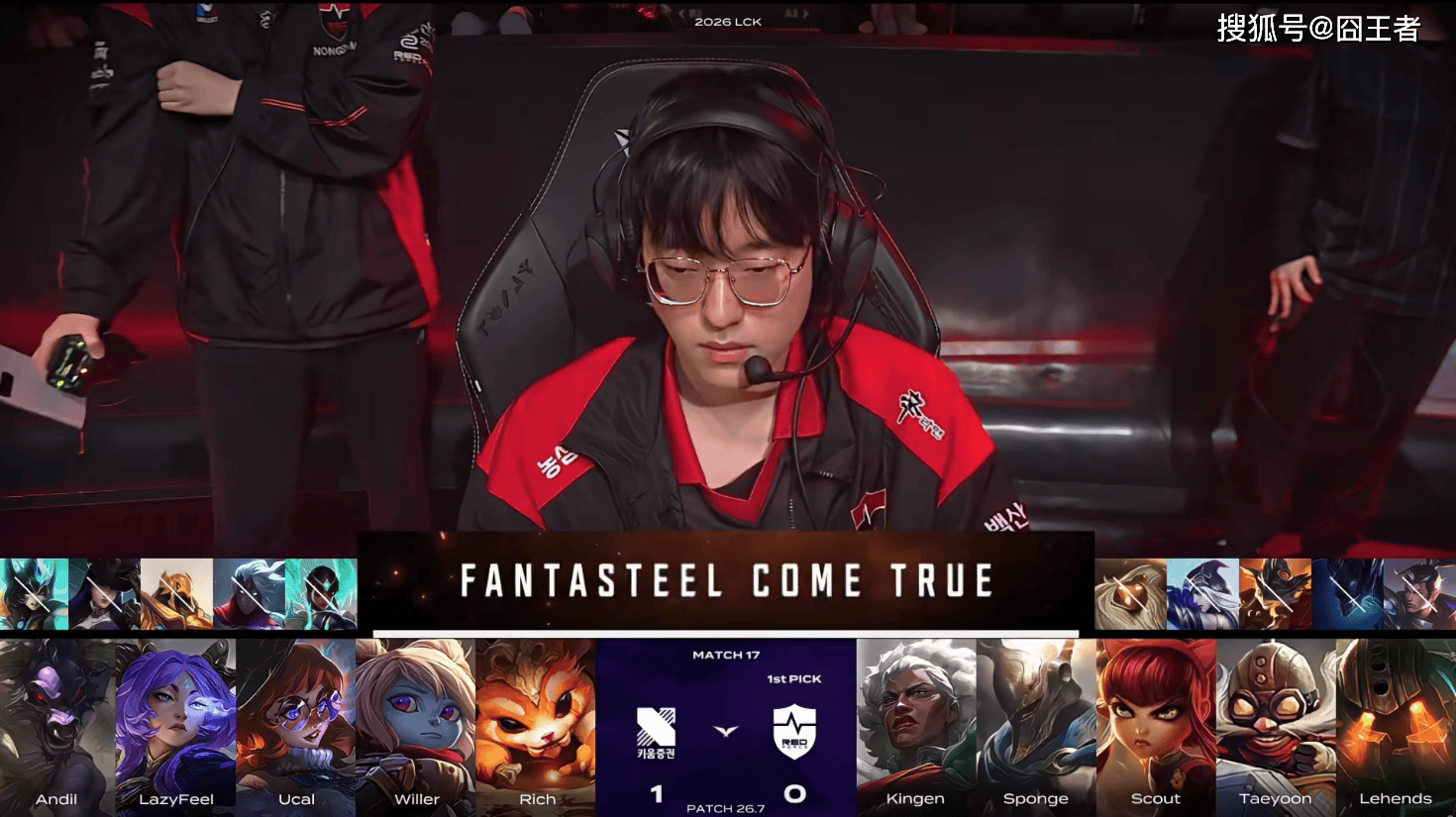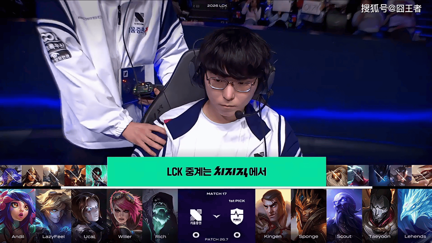 第一局比赛,KRX蓝色方,禁用:扇子妈、兰博、潘森、轮子妈、芸阿娜,选用:Rich掘墓、Willer蔚、Ucal发条、LazyFeel EZ、Andil妮蔻;NS红色方,禁用:巴德、韦鲁斯、梦魇、赵信、狼狗,选用:Kingen杰斯、Sponge皇子、Scout瑞兹、Taeyoon烬、Lehends冰鸟