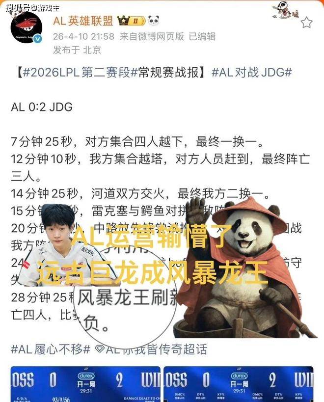 比赛结束之后,al战队选手的状态没有登上热搜,反而是战队运营一下子火了起来。在第二场比赛的官方战报中al战队的运营出现了严重失误。28分钟25秒,风暴龙王刷新,双方争夺,团战我方阵亡四人,比赛告负。也不知道工作人员到底是怎么想的,连王者荣耀的风暴龙王都出现在了英雄联盟的战报之中了。最搞笑的是,官方更改了三次之后,才把风暴龙王的名字改成了远古巨龙,这个风暴龙王在界面足足挂了11分钟。不知道是运营故意的,还是真的没有发现。