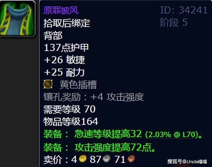 作为太阳之井高地小怪掉落的披风,原罪披风凭借其极高的综合属性,成为物理DPS的毕业披风之一。它不仅提供暴击、攻强等基础属性,更关键的是附带的急速等级加成,虽然对于该披风的争议颇多,但是喵叔个人觉得大后期满破的前提下,原罪披风依旧是版本最强存在,无可挑剔,真真是无可挑剔。