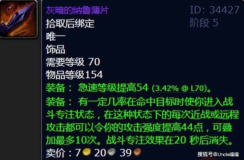 在TBC版本的最终副本太阳之井高地中,穆鲁掉落的灰暗的纳鲁薄片,堪称物理系急速装备的“天花板”。这件饰品不仅常驻54点急速等级,更有触发式的“战斗专注”效果:每次攻击命中可叠加44点攻强,最多10层,持续20秒。