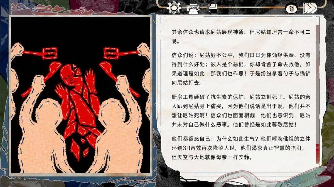 例如游戏中穿插着的小说桥段,糅合了尼姑、抗生素和厨具杀人的元素,有着寓言的质感;