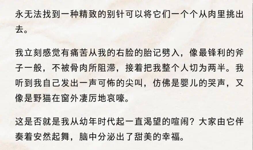 这些灵巧的比喻,将抽象模糊的感受化作了一个具体可感的生活场景,而更有一类比喻,读之几乎可以让人感受到幻痛: