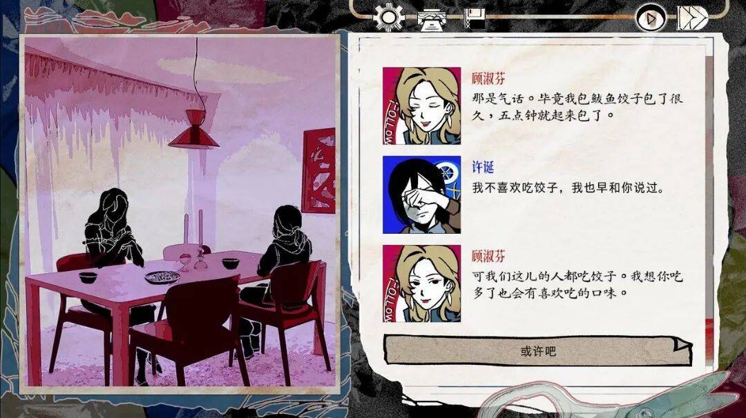 选项带来的剧情差分,意味着许诞哪怕在不爱吃饺子这样的小事上没能坚持自我,屈服于顾淑芬的意志,就会落入“皇帝”结局:许诞会心甘情愿地居于顾淑芬的掌控之下,跟她和她的女儿一起出国,变成名正言顺的家人,落入这种世俗的幸福和完满之中——不管是否对顾淑芬的真心有过一丝怀疑。