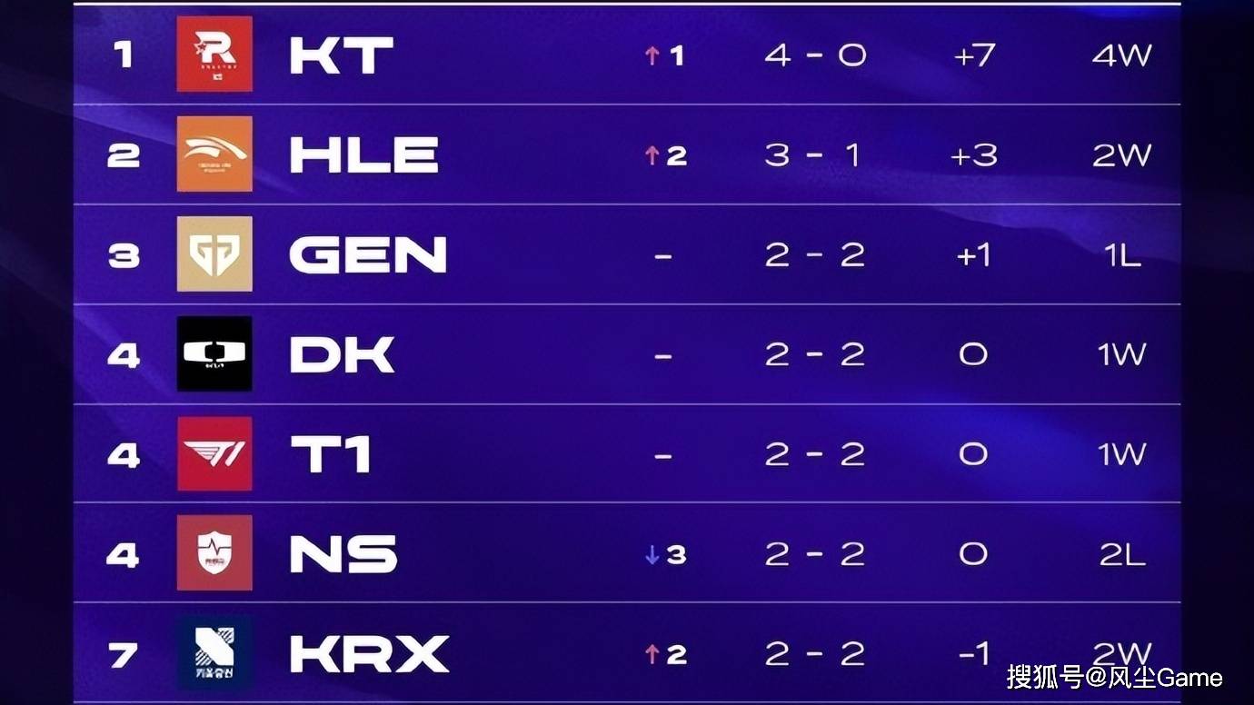 这个赛段LCK的队伍排名,跟LPL一样变化很大,内战幻神GEN输两场,战绩和DK、NS、T1相同,但因为小场多赢了一把,GEN暂时位列第三,剩下三队的话并列第四,HLE这个赛段,战力也上来了,四场只输了一局,3-1仅次于KT,LCK今年的MSI队伍,现在感觉一点都看不出来啊。