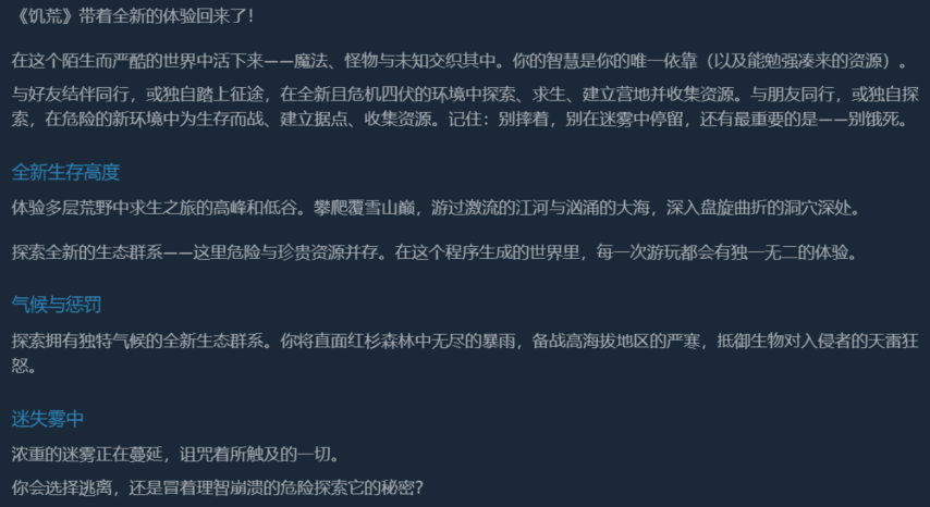 相较于前作,本作新增了Z轴判定与独特的迷雾机制。弥漫的浓雾会不断挑战玩家的理智,迫使他们在逃离危险与深入探索秘密之间做出抉择。Steam商店页面明确提示玩家“别摔着、别在迷雾中停留、别饿死”。