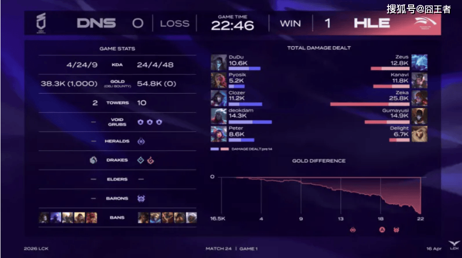 结果第一局比赛,HLE简直想个杀神,22分钟速通DNS。第三分钟:HLE野辅联动从侧翼杀出,成功击杀妮蔻由赵信拿下一血;第四分钟:Zeka阿萝拉在中路完成对位单杀;第九分钟:HLE集结主动对DNS下路施压,双方下路瞬间爆发四打四团战,HLE打出一换三占得上风;第十二分钟:HLE野辅先手针对对方上单,尽管妮蔻及时支援,但HLE二次进场将两人全部击杀;第十八分钟:DNS上野绕后开团却被HLE打出零换三,随后凤凰持续追击将剩余两人全部击杀完成团灭;最终22分46秒:HLE团灭DNS,一波结束比赛
