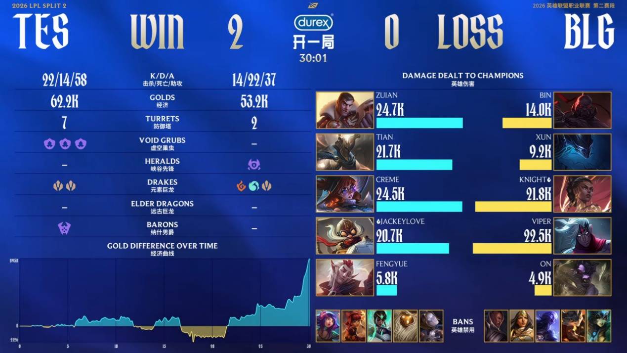 因塞恩发育不佳,BLG前排站不住,导致后期团战接不过,Viper的韦鲁斯也是发挥低迷,仅靠着Knight梅尔苦苦支撑,最终BLG是被TES横扫输掉了这场关键比赛,不败金身也就此告破。