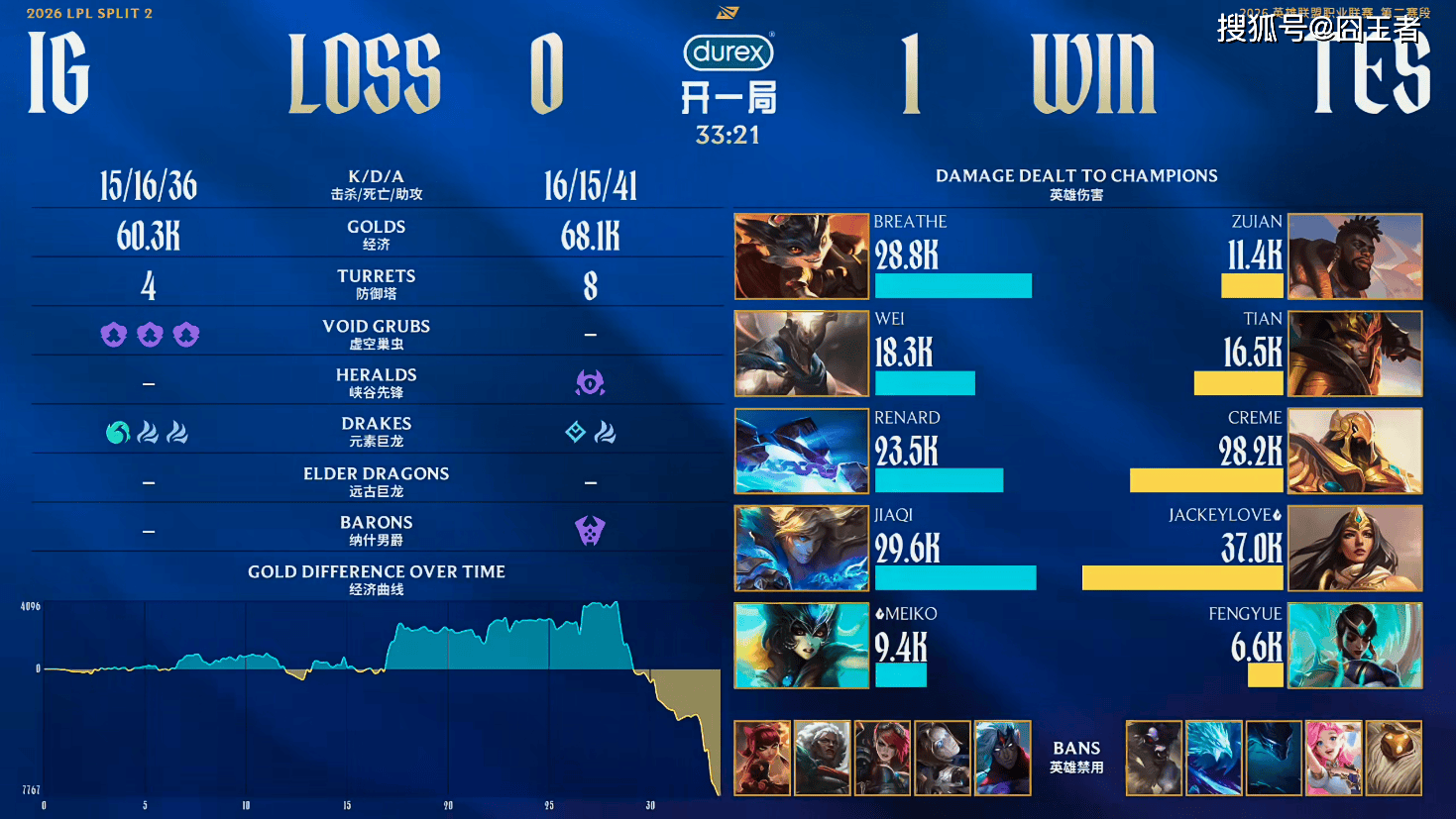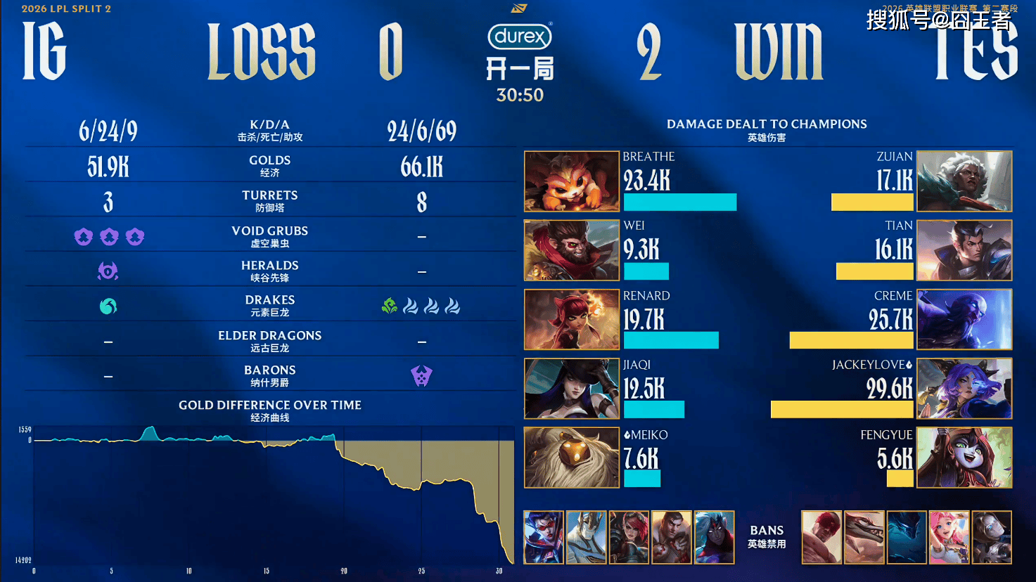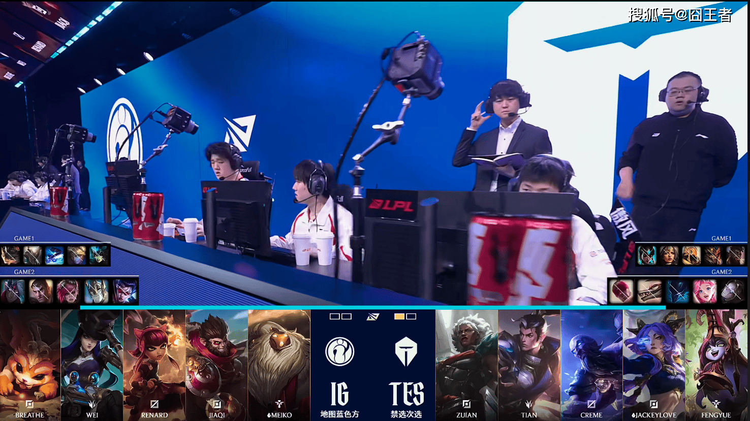 第二局比赛,IG蓝色方,禁用:韦鲁斯,杰斯,蔚,加里奥,VN,选用:Breathe纳尔,Wei猴子,Renard安妮,JiaQi女警,Meiko巴德;TES红色方,禁用:发条,萨勒芬妮,梦魇,纳亚菲利,盲僧,选用:ZUIAN狼母,Tian赵信,Creme瑞兹,Jackeylove芸阿娜,fengyue璐璐