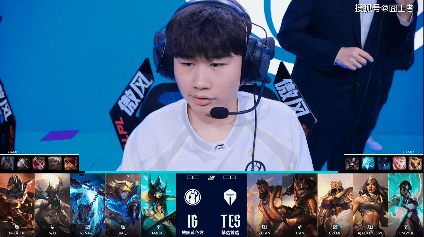 第一局比赛,IG蓝色方,禁用:韦鲁斯,发条,蔚,狼母,安妮,选用:Breathe兰博,Wei潘森,Renard泽拉斯,JiaQiEZ,Meiko娜美;TES红色方,禁用:巴德,萨勒芬妮,梦魇,冰鸟,牛头,选用:ZUIAN奎桑提,Tian皇子,Creme沙皇,Jackeylove希维尔,fengyue卡尔玛