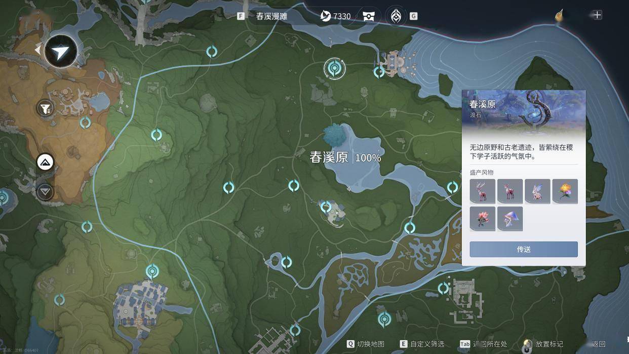 地图上会有一些传送点,我们在新手教程指引的时候让我们开启过一个叫渡石的,只要我们不在战斗状态,打开地图都是可以直接传送的,还有一些挑战点之类的,只要我们去过激活了,后续都可以直接传送。我们再跑图的时候一定要留意附近的这些东西,路过就激活一下,后续跑图就会方便很多了。
