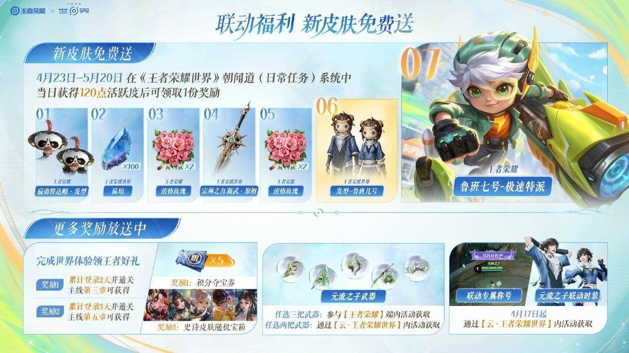 这次的新活动是在王者荣耀世界中,每天拉满每日任务,然后连续7天可以获取到鲁班七号的新皮肤,其中每一天还会有一些其他的福利,有的是王者荣耀的,有的是世界的。