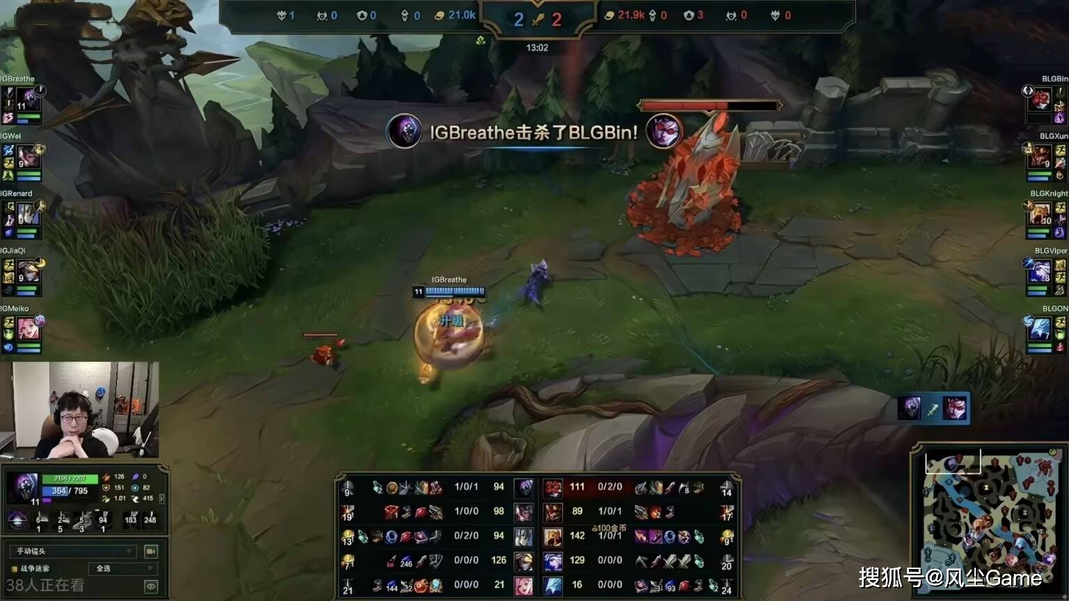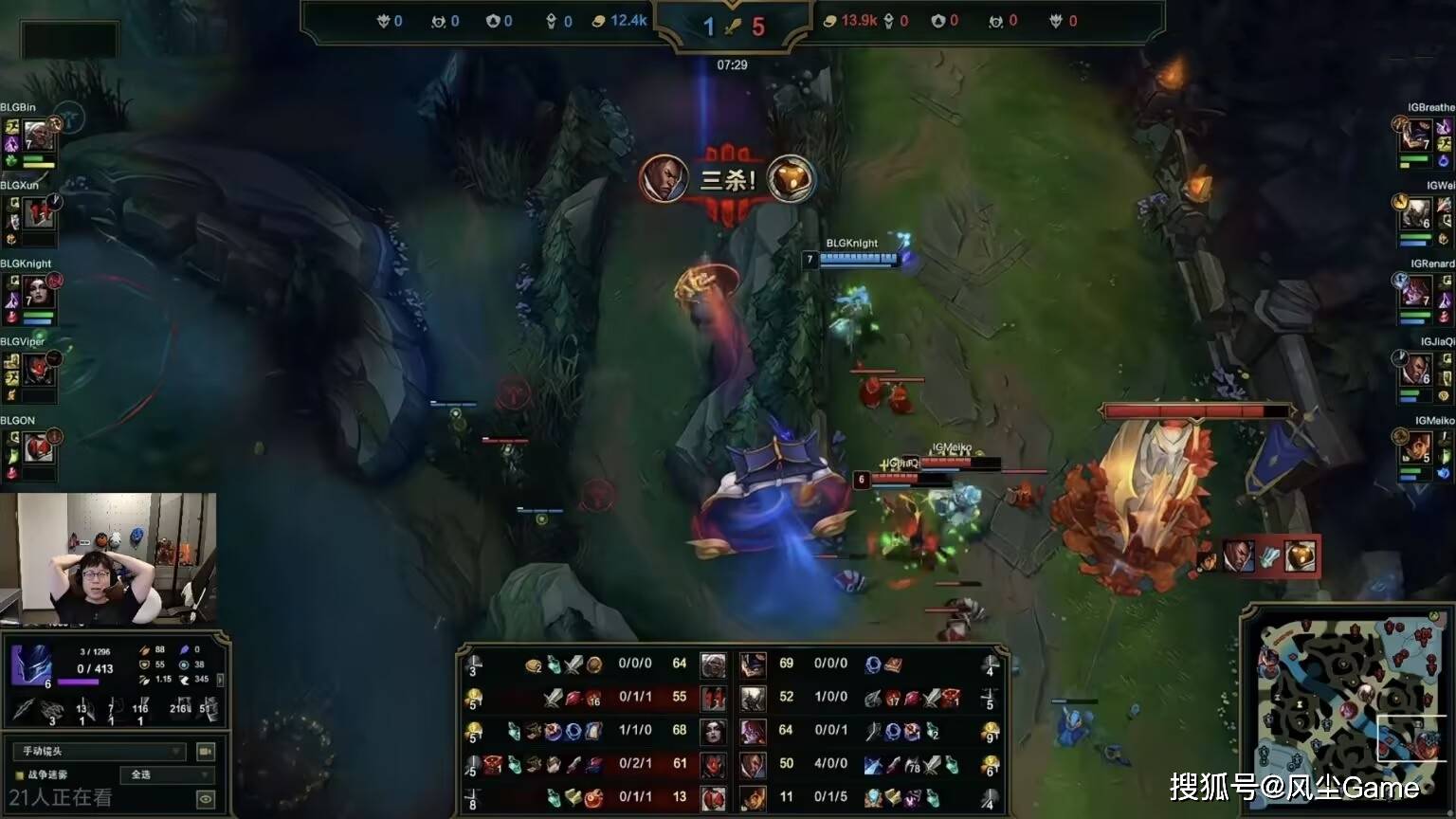 第一把开局6分钟,IG就打出5:1的人头差,下路Jiaqi卢锡安连吃四个头,但BLG韧性很强,左手存在感拉满,各种游走帮队友追平经济,打到20多分钟的时候,左手上去消耗掉点,直接送掉了大龙,后续的团战BLG就越打越丑陋了,一接团就有人失误,撑了32分钟,最后被IG先下一城。