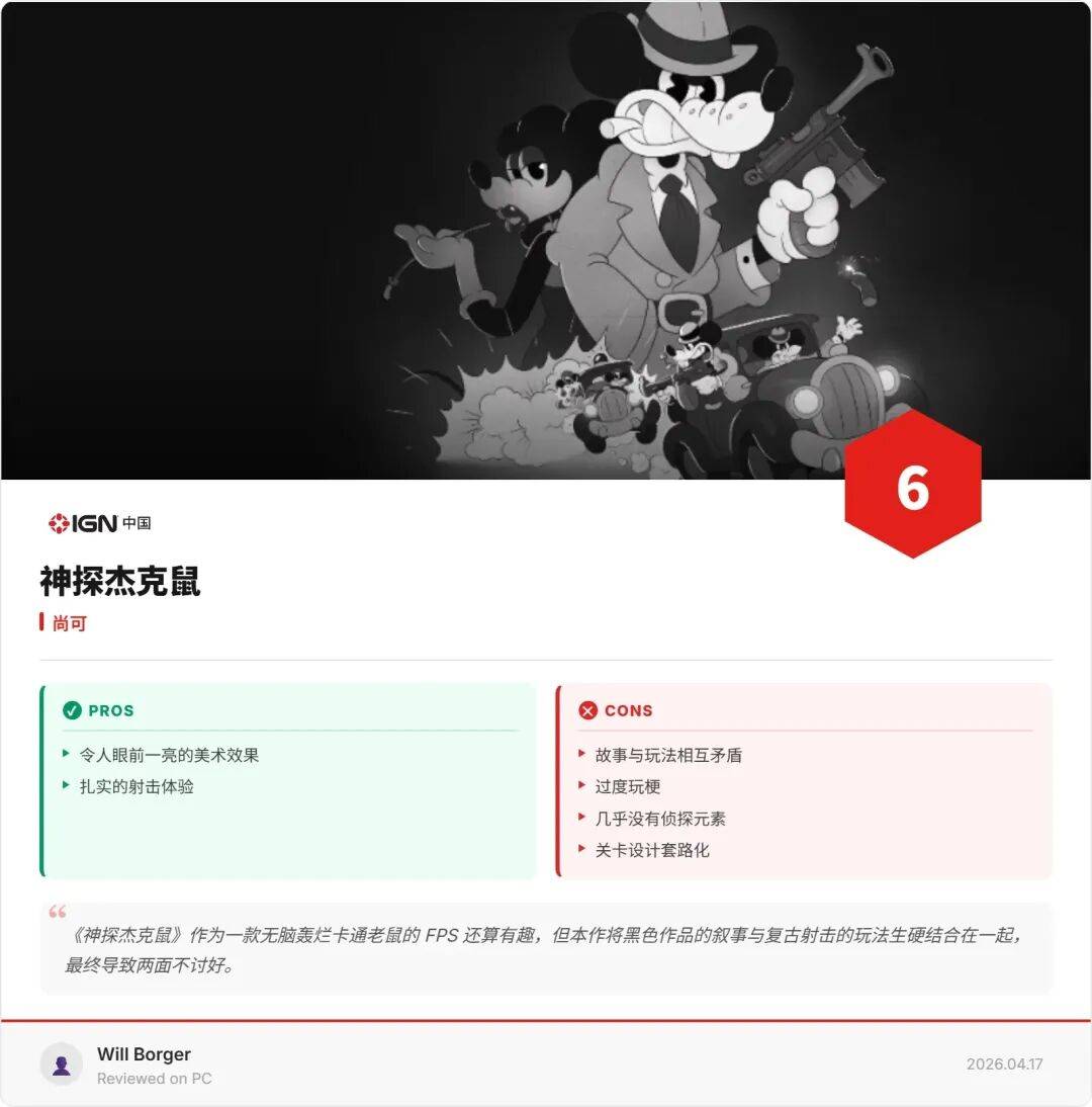 批评IGN的一方认为,评测者用严肃黑色电影的审美标准去衡量一款"以米老鼠卡通为灵感的恶搞射击游戏",属于评价框架的错位。《神探杰克鼠》从立项起就是一款强调操作反馈与怀旧快感的boomer shooter,它无意模仿《马耳他之鹰》式的严肃叙事,而是在卡通化暴力美学与冷硬侦探叙事之间寻找一种荒诞的化学反应。也有玩家将IGN此前给《使命召唤:黑色行动7》和《红色沙漠》的评分拿来对比,质疑其评分标准的一致性。