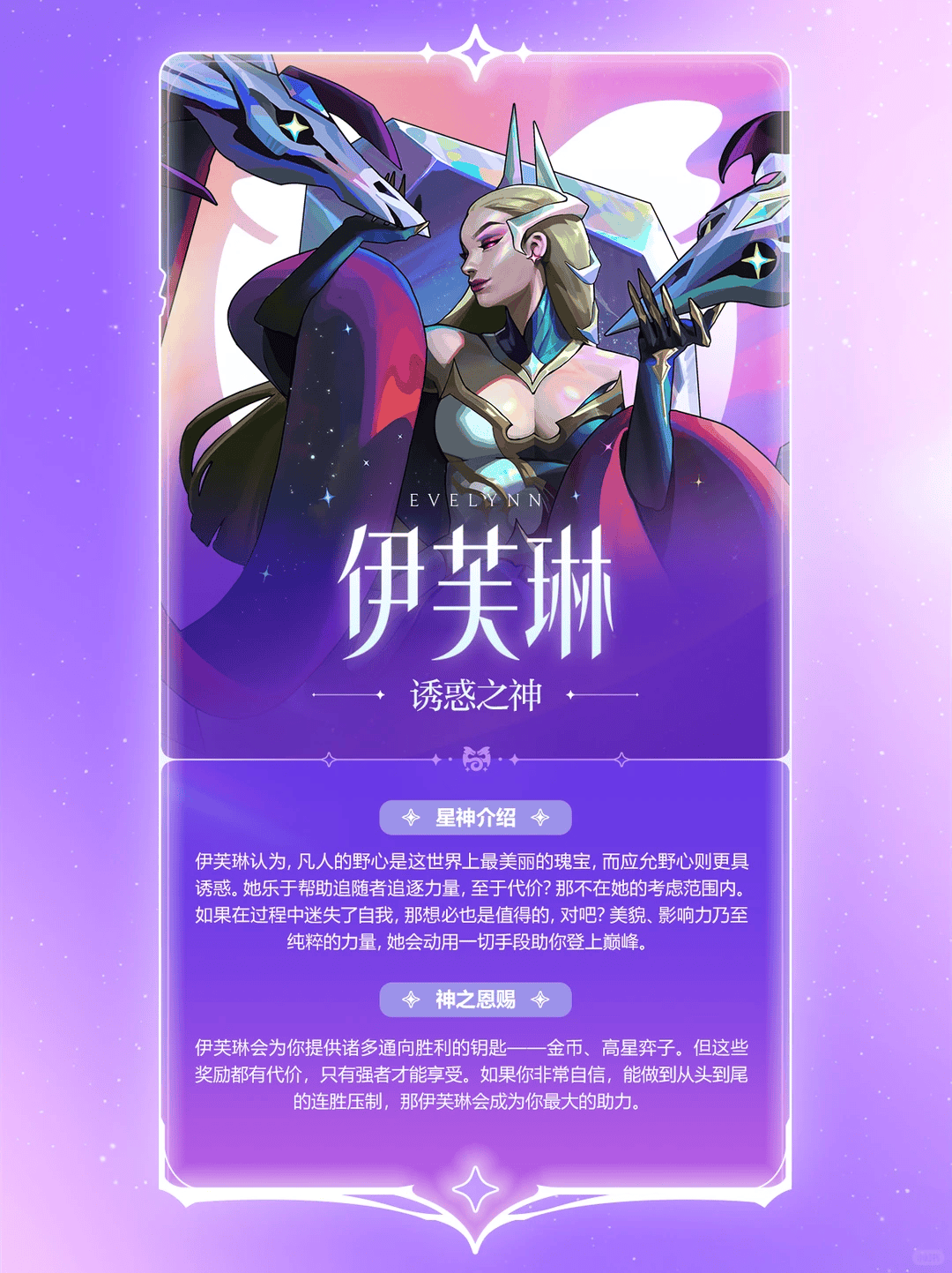 「星神」赛季的主题自然是以“星神、宇宙”为核心,给我最强烈的印象便是整体视觉与美术风格的梦幻与磅礴,九位神明以美漫独有的粗犷笔触呈现在对局之中,在初遇时极富冲击力,同时,棋子配色与羁绊设计也围绕星象占卜展开,赋予了整个赛季强烈的沉浸和主题统一感。